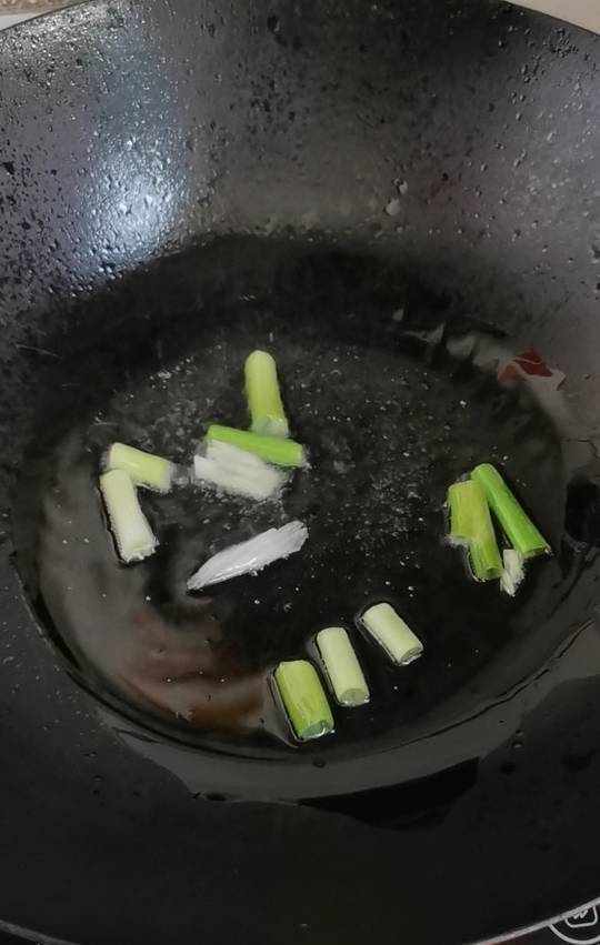 1.鍋中放油,下入蔥段炒香。