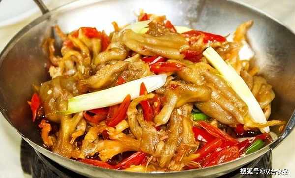 2、鍋裡加少許沙拉油熱,下豬五花肉丁炒到冒油時,放入野山椒末、洋蔥碎、蔥根顆、薑顆、香菇丁、毛筍丁和豆芽菜末,炒出香味時摻加適當骨湯,然後放入鹵好一點的鵝掌,燒沸便改小火收汁,期間放入醪糟汁、米酒和雞精粉調好味,待收至鍋裡汁幹後淋入芝麻油,起鍋擺盤既成。