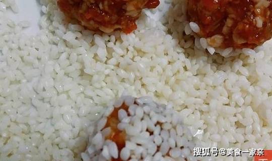 4.把肉餡做成肉丸沾滿糯米