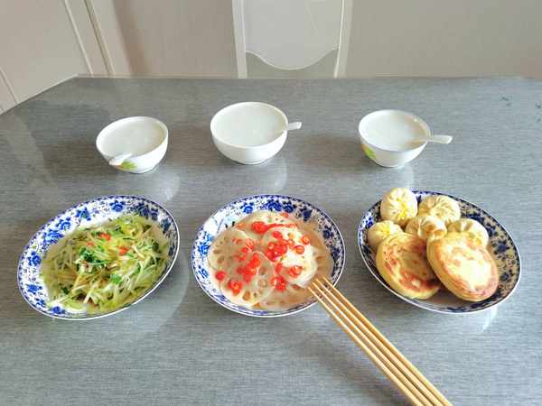 南瓜包子、發面餅,酸辣藕片,香菜蘿卜絲,大米稀飯。