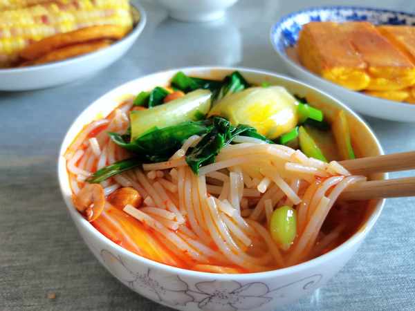 蔬菜麻辣米線,烤南瓜酥饃,蒸玉米。