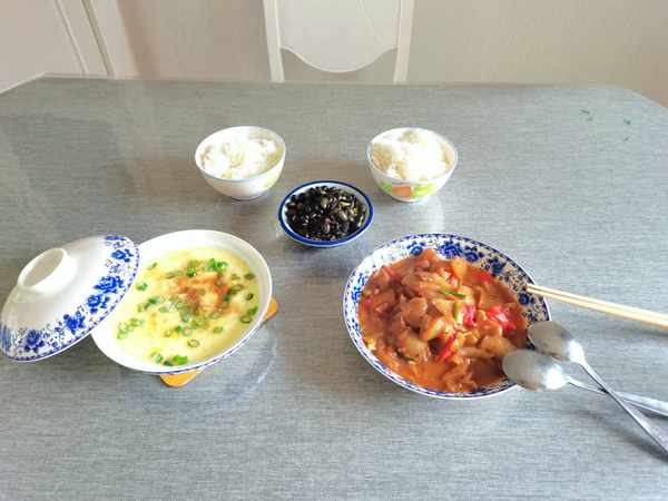西紅柿燒茄子,蒸雞蛋羹,醋泡黑豆,米飯。