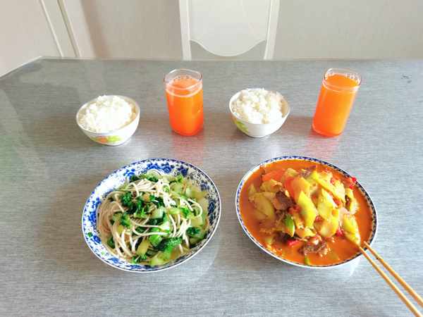 牛肉炒角瓜,蒜泥小白菜拌粉條,紅蘿卜汁,米飯。