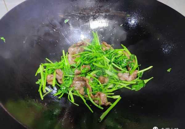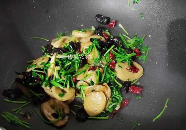 中大火將鍋中的食材翻炒30秒鐘左右,加入適量的蠔油,醬油,食鹽,雞精進行調味。接著將香菜也放入;
