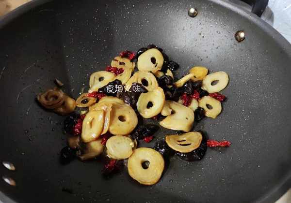 3.熱鍋中下入適量的油,油溫熱後,將切好的面筋跟木耳倒入鍋中。