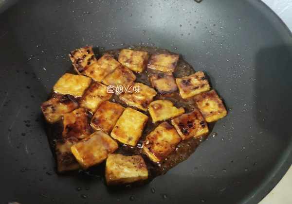 2.豆腐煎至兩面焦黃後,.準備一個幹凈的碗,加入適量蠔油,醬油,玉米淀粉,少量的水,用筷子將其攪拌均勻,隨後倒入鍋中。鏟子翻炒,使鍋中的豆腐都能均勻裹上一層醬汁。