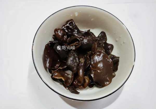 1.木耳泡發後會膨脹很多,所以要煮的時候準備一小撮的木耳即可。準備好的木耳放在碗中,往裡面加入適量的溫水,放著浸泡15分鐘左右。泡發後再用清水洗凈放在一旁;