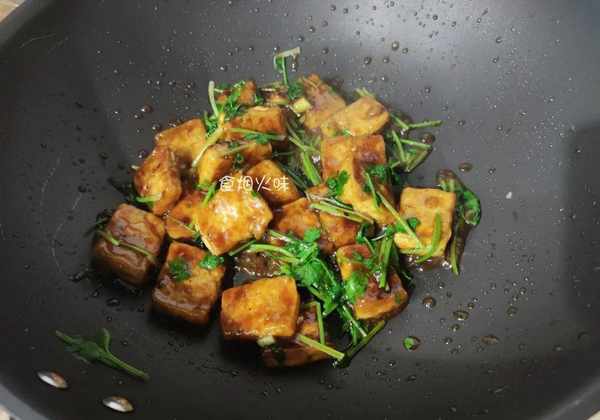 3.鍋中的豆腐燜煮好後,加入切好的芫荽,用鏟子將鍋中的食材炒至均勻即可。因為醬汁以及豆腐都有咸味,所以最後不需要再加食鹽調味瞭。
