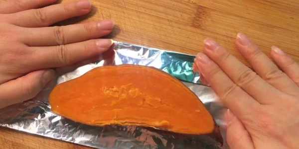 3.準備一張錫紙,兩邊折疊,包裹住紅薯