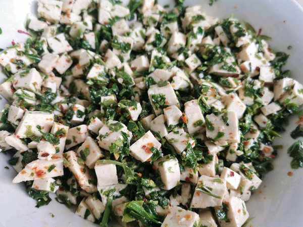 3,香椿芽燙好之後,用手掐一下香椿莖,如果比較老可以去掉,隻留下嫩的地方。接著再把香椿芽切碎放入大碗中,然後把豆腐也切成小塊一起放進去。