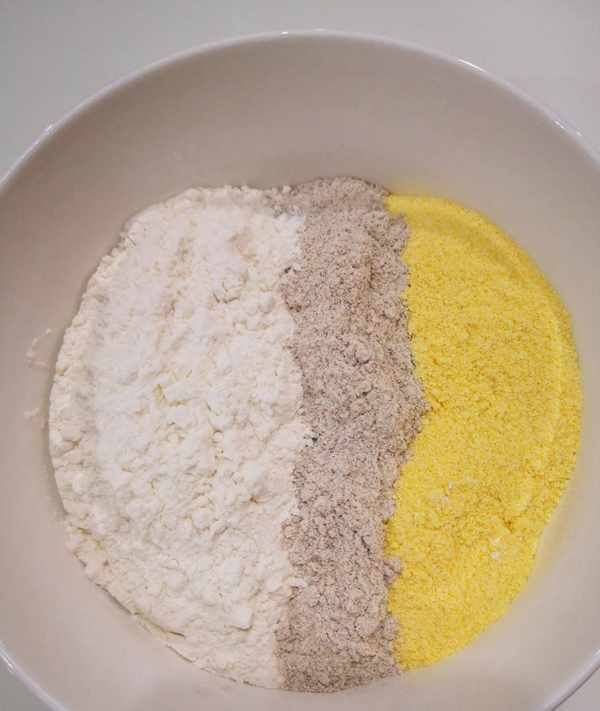 碗中加適量小麥面粉、黑麥面粉、玉米面粉,比例為3:1:1。