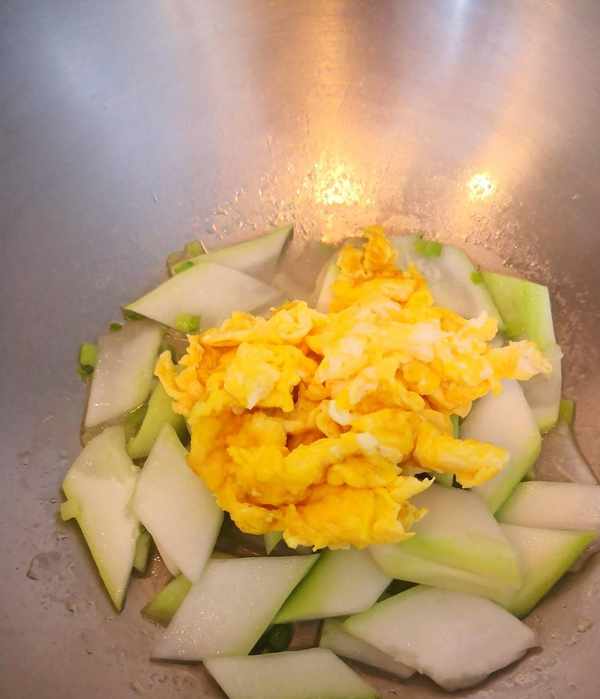 鍋裡倒少許油,倒入蔥花炒出香味,倒入瓠子翻炒至瓠子斷生再倒入炒熟的雞蛋,加少許鹽調味,翻拌均勻即可。