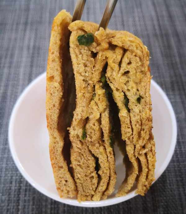 重復翻面三四次,烙至餅鼓起,用勺子按壓能迅速回彈表示餅已熟。