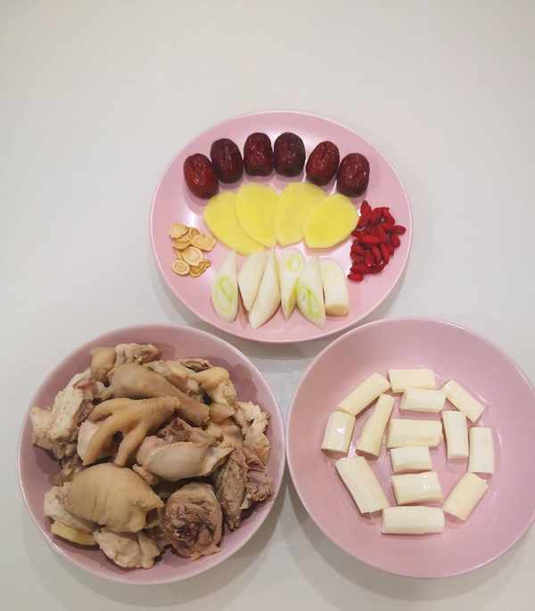 準備適量的紅棗、生薑、西洋參、蔥、枸杞、山藥去皮切成段,食材配齊備用。