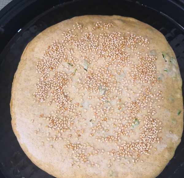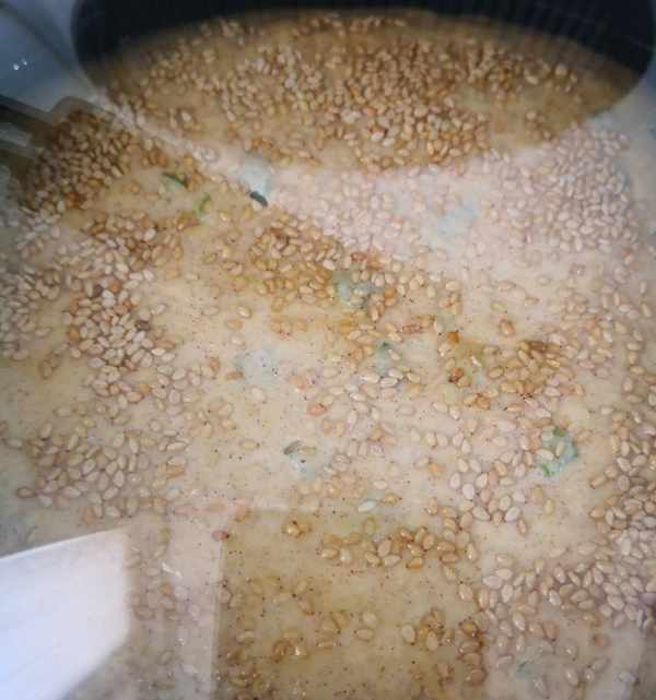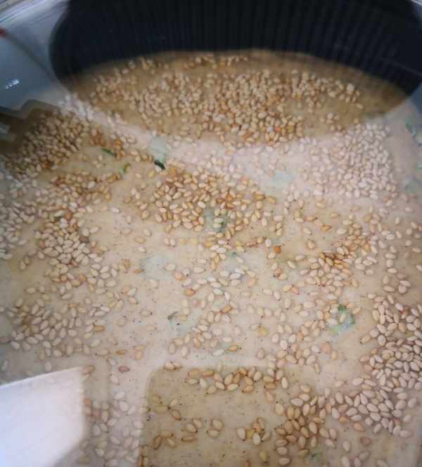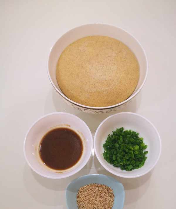 面發酵好後,碗中加一小勺黑麥面粉或小麥面粉,加點芝麻油或者澆熱油調成沒有顆粒的稀面糊,愛吃咸味的可以加點鹽拌均勻,這裡我加的是黑麥面粉,所以調出來的油酥顏色偏深;蔥青切小圈,芝麻炒熟備用。