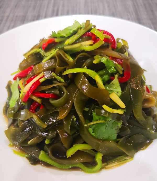 水開後倒入泡開的海帶絲煮1分鐘撈出控水,加青紅椒絲、香菜、芝麻油、鹽、生抽、陳醋拌均勻即可,愛吃蒜泥的可以加點蒜泥,酸香開胃,清淡爽口。