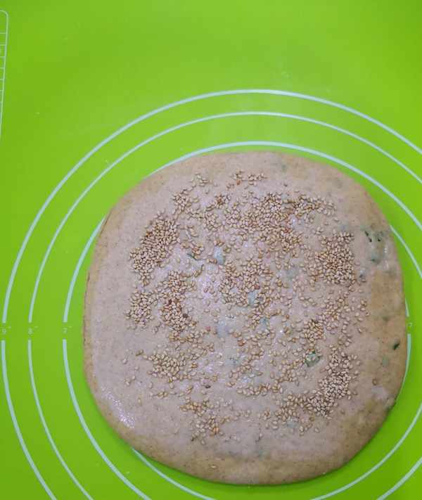 表面刷少許清水,撒點熟白芝麻,再用搟面杖輕輕搟壓,使芝麻沾得更牢固些。