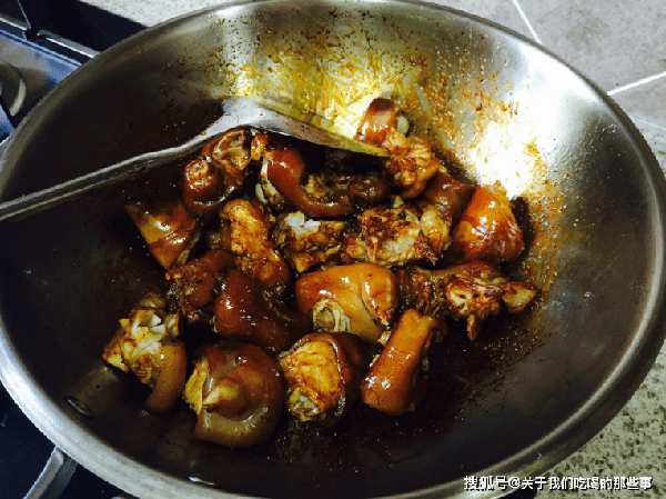 4、豬蹄軟爛後加入適量鹽調味,轉大火收汁,不停地翻炒,防止粘鍋糊底,等到湯汁濃稠後即可關火出鍋。
