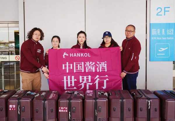 精兵簡員,輕車熟路,旗幟鮮明,行李整潔。隨行的四面紅底白字隊旗上,分別寫著“中國醬酒世界行”“中國好酒出貴州”“仁懷產區醬香正宗”“讓全世界愛上中國醬酒 讓全世界享受中國品質”。一聲清脆的快門聲響起,高粱紅的人群與宣言,一同被定格在首都機場二樓。