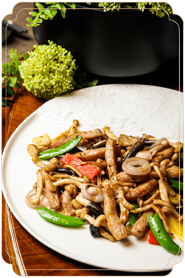 甄選上佳珍菌與豬頸肉等調味在大火中爆炒,散發著無盡的誘惑力~