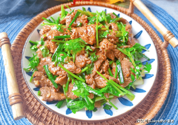 最後牛肉中倒入料汁攪拌均勻,再放入香菜攪拌均勻,就可以食用瞭。