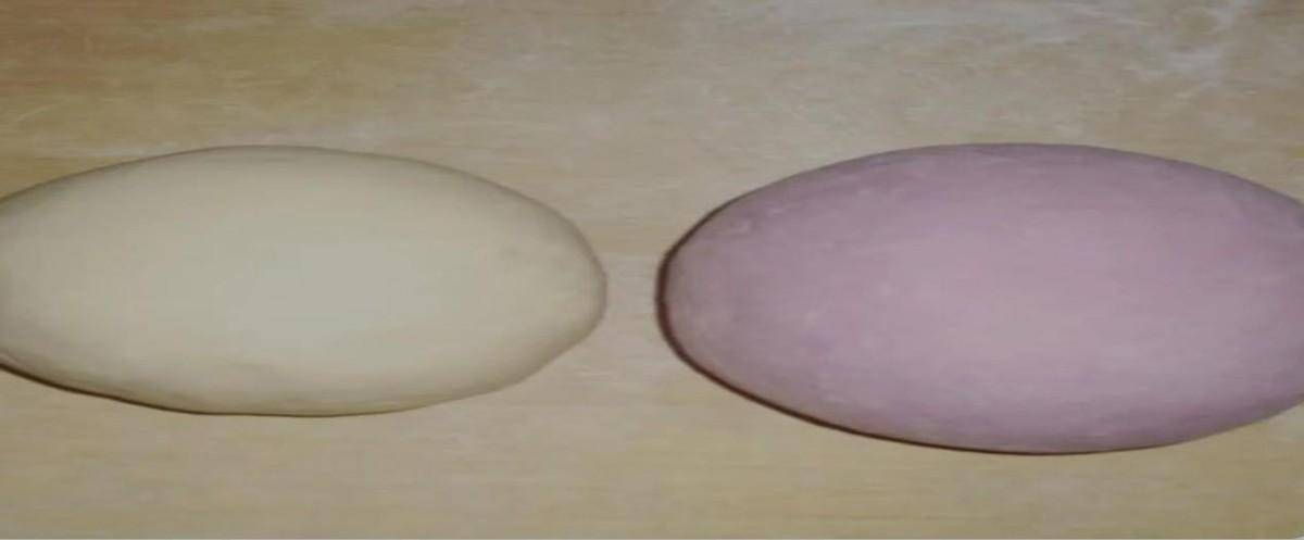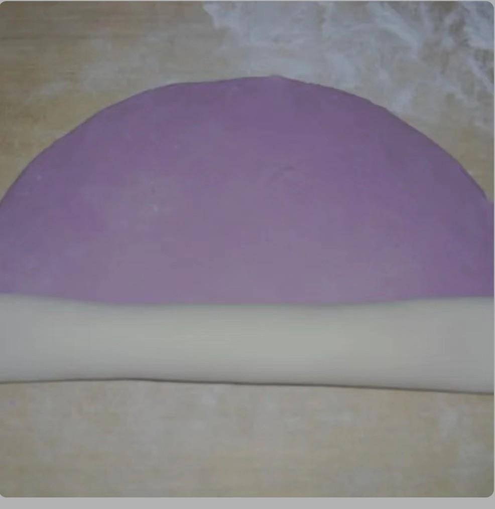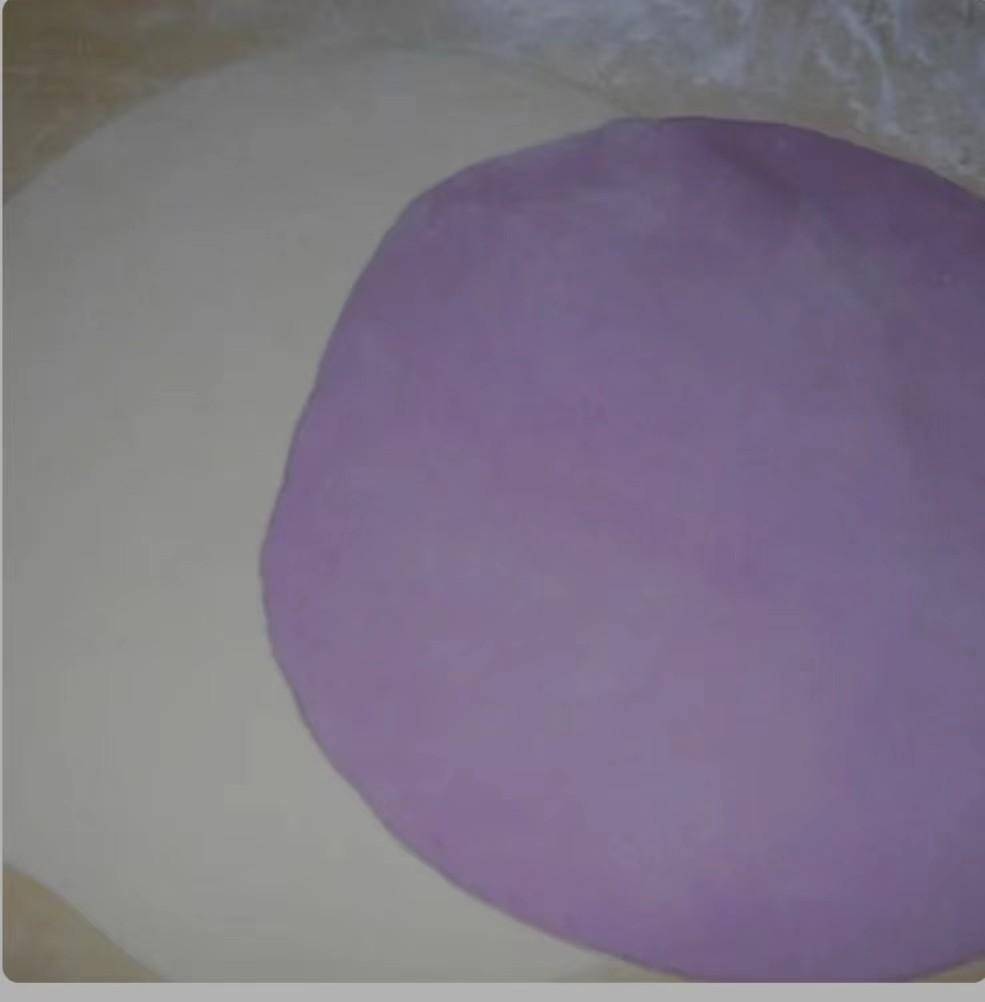 第1步:紫薯洗凈,切片,上鍋蒸20分鐘,晾涼碾成泥。溫水融化酵母,分成兩份,分別和進紫薯泥面團和白面面團,放入溫暖處酵。