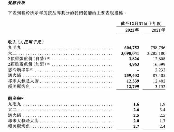 例如太二客單價由2021年80元降至2022年77元,翻座率由2018年最高點4.9降至目前2.6。