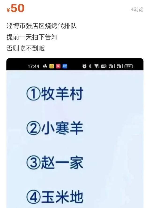 那些最火的燒烤店,還有人發佈瞭代排隊業務,50塊錢一次,需要提前一天預約。