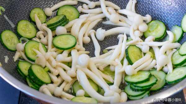 5、繼續起鍋熱油,加蔥花爆香,然後加白玉菇和黃瓜炒一炒。