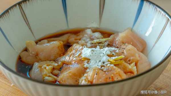 3、雞胸肉一塊兒。洗凈後切塊兒,或者是大一點的丁。裝入碗裡後加薑絲、生抽、料酒、淀粉、胡椒粉,抓拌均勻醃制10分鐘入底味兒。