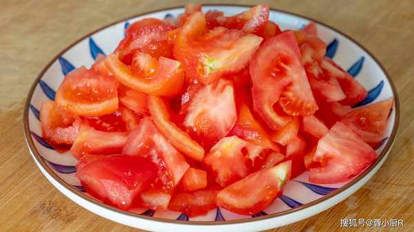 1、西紅柿3個,頂部劃十字口後用開水燙一下,西紅柿的皮就輕松撕下來瞭。