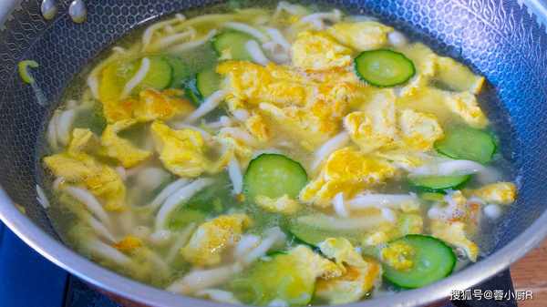 6、斷生後加一碗開水煮2分鐘,再倒入雞蛋繼續煮3分鐘。出鍋前加鹽和胡椒粉調味,清淡又低脂的黃瓜湯就做好瞭,鮮美又解膩。