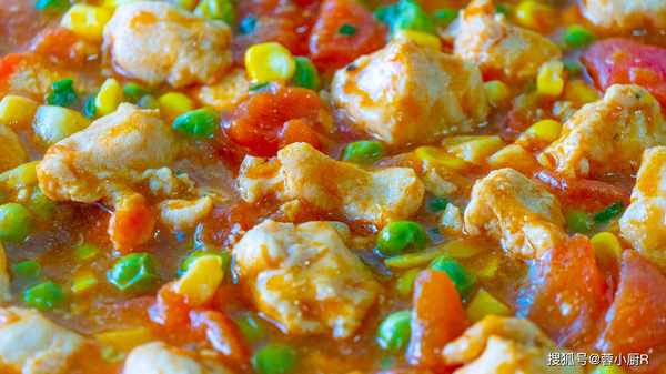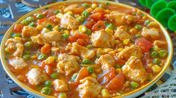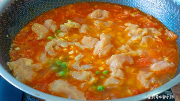 » 食材清單 « 西紅柿3個、雞胸肉1塊兒、豌豆、玉米粒、薑絲、蔥花