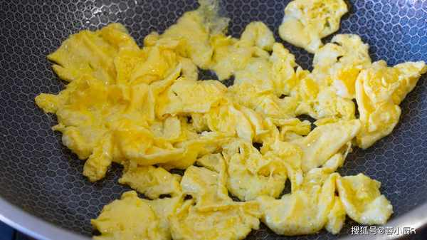 4、起鍋熱油,倒入蛋液,煎熟後劃成小塊兒盛出備用。