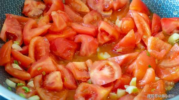 4、起鍋熱油,下蔥蒜爆香,倒入西紅柿翻炒,加一勺鹽更容易出汁兒。