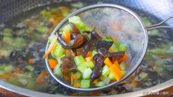 3、中火煮20分鐘,煮好後倒出來再泡2個小時,這樣會更入味兒。鍋裡另外燒水,加一勺鹽和半勺油,水開倒入芹菜、胡蘿卜、木耳煮兩分鐘,木耳煮熟後就可以撈出來瞭。蔬菜焯水的時間加食用油,能保證顏色鮮艷好看。