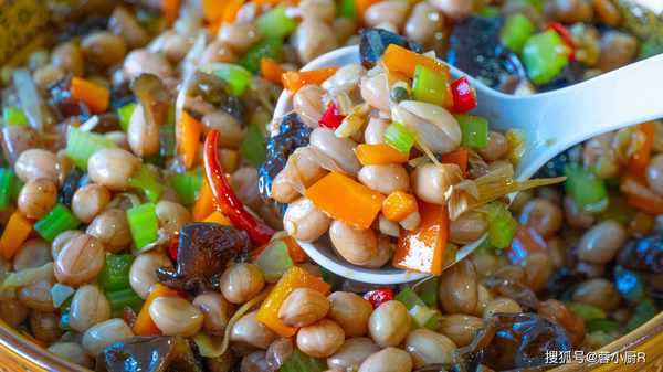 4、過一下涼水顏色會更好看,然後控幹水分,鍋裡的花生泡好後撈出來,然後倒上焯過水的蔬菜後開始調味兒,小米辣,蒜末,熱油,生抽、蠔油,鹽,糖,拌勻後就可以開吃瞭。不建議放醋,因為醋會使芹菜、胡蘿卜變色。