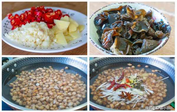2、蔥薑蒜小米辣各準備一些,大蔥切蔥絲,生薑切片,大蒜切蒜末,小米辣切圈圈備用。木耳泡好後再清洗一下,洗凈後先放在一旁。花生這時候也泡好瞭,倒出來瀝幹水分。起鍋燒水,倒入花生,加大蔥、薑片、花椒、八角、幹辣椒、鹽,先入一下底味兒。