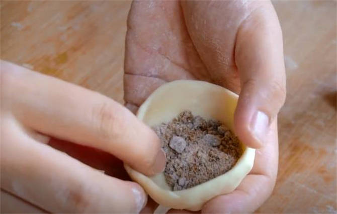 8.取出來一個,捏出小窩窩,中間包上紅糖餡,再把收口處收緊。