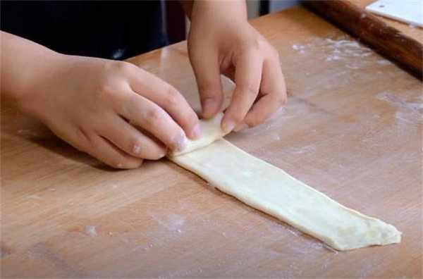 5.收口處朝下按扁,搟成牛舌狀,搟好之後給它橫過來,兩端疊在一起,再搟長。