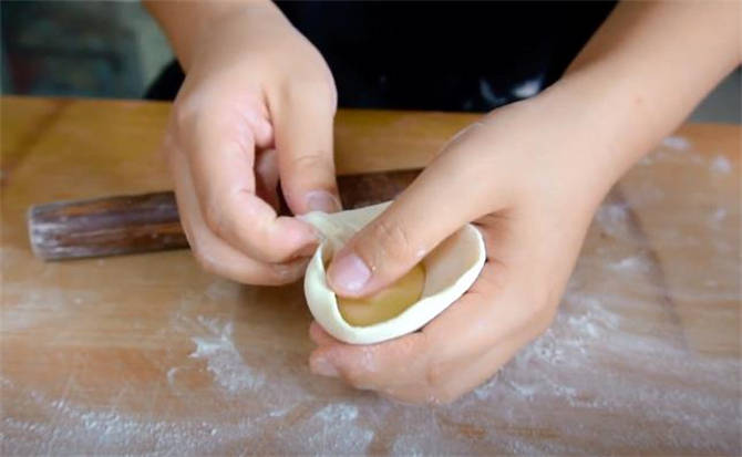 4.直接把面劑按扁,搟成一張餅皮,中間包上一顆油酥餡,把這個收口處封緊。