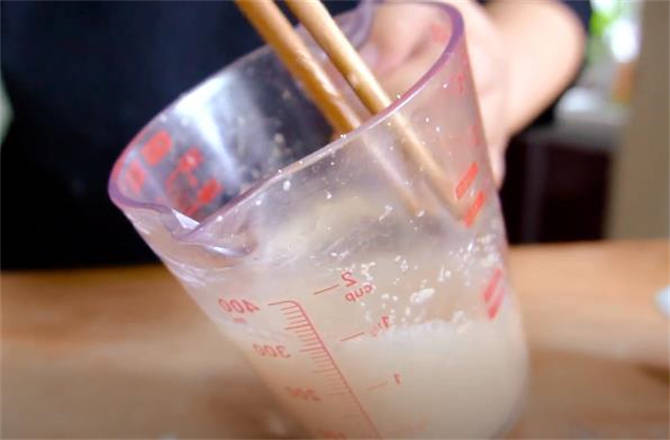 1.現在我們先把酵母水給和上,這是160g的溫水,加上3g的酵母粉攪化開。