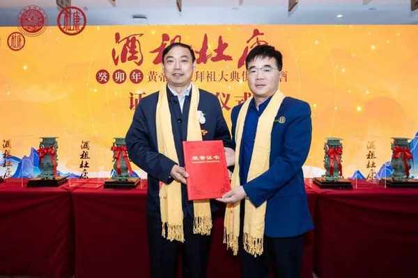 儀式現場,市政協辦公廳三級調研員劉言平向杜康控股副總經理武小嶺頒發瞭癸卯年黃帝故裡拜祖大典供奉用酒證書。