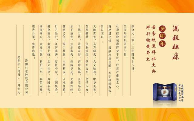 作為新一代的杜康人,我們深感自己責任重大,積極響應政府號召,堅守“一生釀好一壇酒”的工匠精神,我們的目標不僅僅是要做好品牌、做好產品、經營好企業,更要擔起應有的時代擔當,做好華夏優秀傳統文化的傳承和弘揚,為黃帝故裡拜祖大典傳統文化盛事、為豫酒振興作出應有的貢獻!