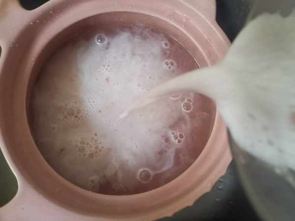 第四步:砂鍋中放入適量的清水,把攪打好的花生汁倒入砂鍋中。大火燒開改成小火慢慢熬大約10分鐘。