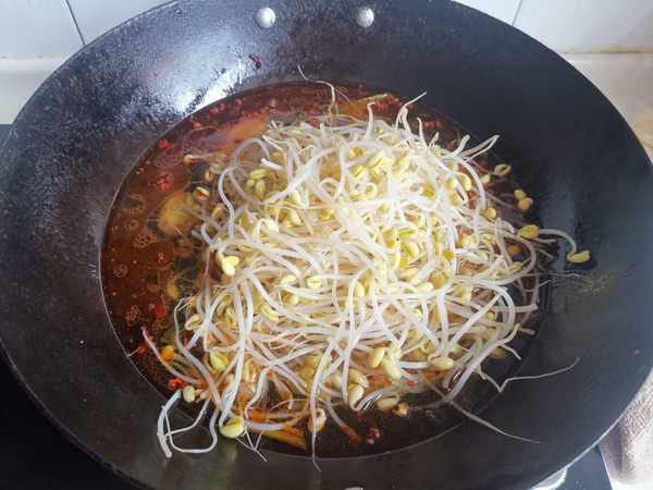 第六步:把汆燙好的黃豆芽倒入小火煮2分鐘。