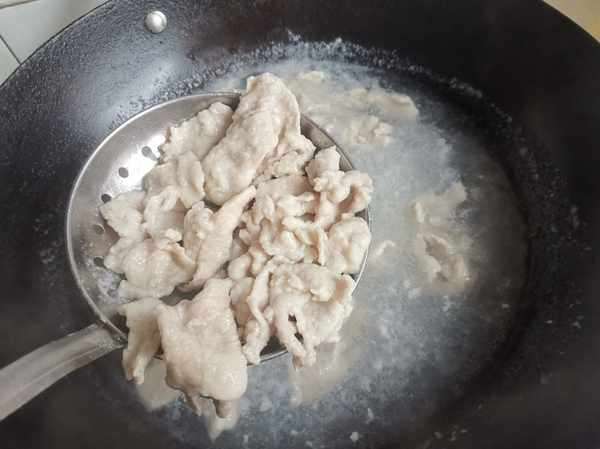 第四步:鍋裏燒水,八黃豆芽汆燙撈出備用,肉片汆燙撈出備用。