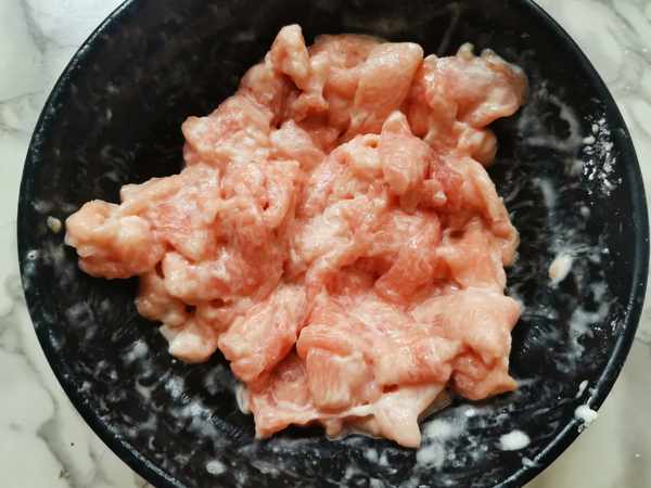 第二步:把肉片放上適量的澱粉和蛋清,用手抓勻醃漬一會兒。這樣處理一下肉片爽滑好吃。