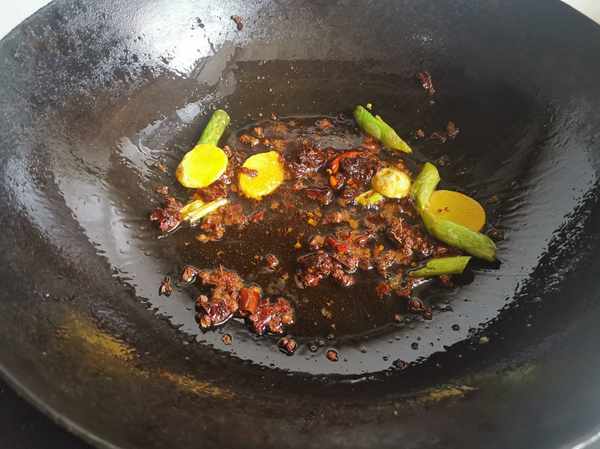 第五步:鍋裏放入花生油,加入花椒八角,麻辣底料,葱段,薑片炒勻,放入適量的高湯或者清水,大火燒開。