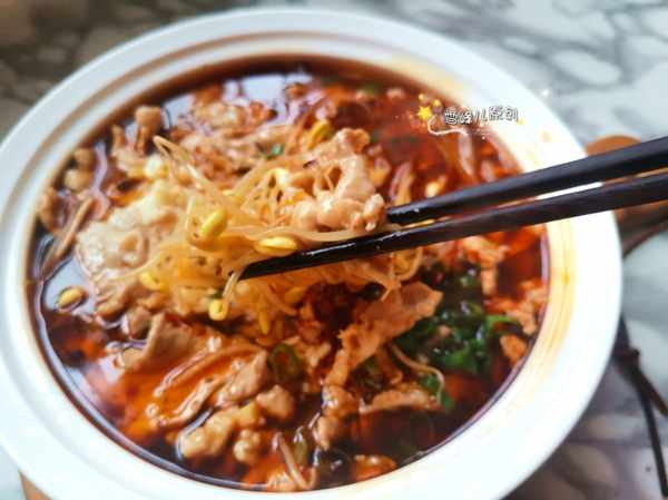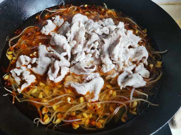 所用資料:猪肉1塊,黃豆芽適量,葱段,薑片,麻辣底料1塊,玉米澱粉1勺,蛋清1個,雞精少許,鹽適量,花椒,大料,花生油少許。
